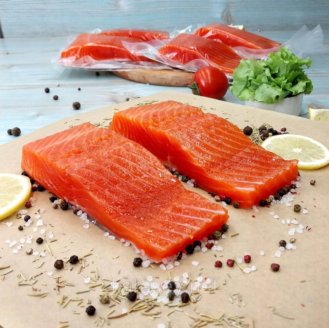 Слабосолене філе лосося виготовлено на нашому власному виробництві з охолодженої риби! Шматочки в вакуумній упаковці на підкладці! Якісний і свіжий товар! Вважається відмінною закускою на столі і найчастіше подається у вигляді нарізки, а також використовується для приготування різноманітних страв!